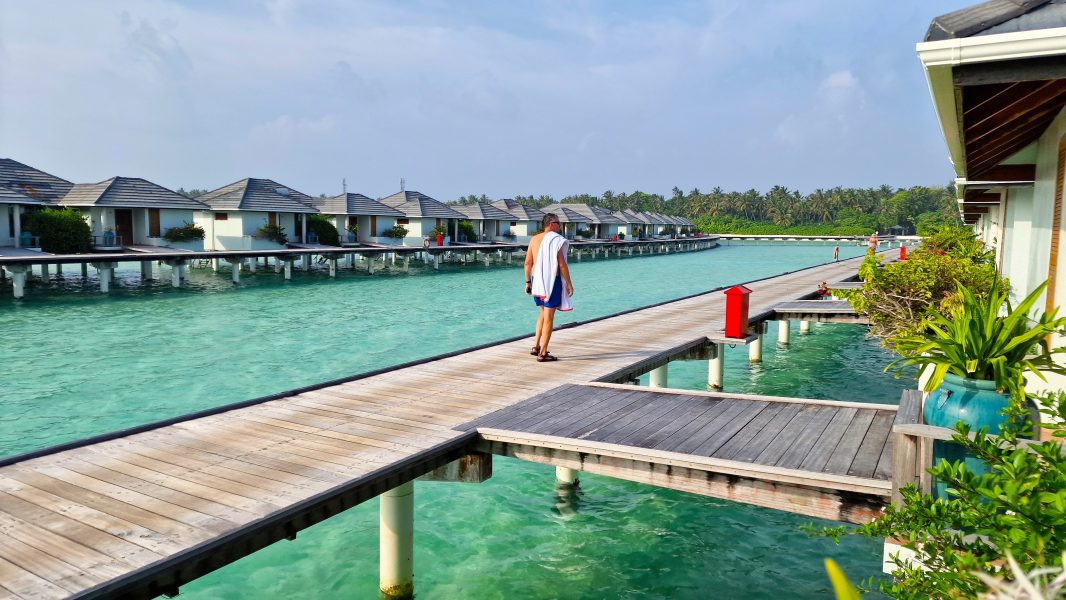 Običajno bi bilo, da bi najprej raziskovala lokalna otočka, na koncu pa se pustila razvajati v resortu. A resorti na Maldivih so najmanj dragi, lahko tudi pregrešno dragi. Tako resort sprva ni bil v planu, a ko sem slučajno našla neverjetno ugodno ponudbo za dve nočitvi tik pred božičem v resortu Villa Park Sun Island blizu lokalnega otočka Dhigurah, nisva pomišljala dolgo. Rezervirala sva takoj. In bila na koncu celo upgrejdana v vodne vile nad laguno v kateri so plavali skati, ribice in mini morski psi. Na otočku je bilo turistov malo, no, vsaj plaže so samevale, kar je res nenavadno. Izposodila sva si kolesa in na najboljši možni način raziskovala koralni otoček. Cena nočitve za dve osebi s polnim penzionom je bila slabih 250 eur, kar je res neverjetno ugodno.
